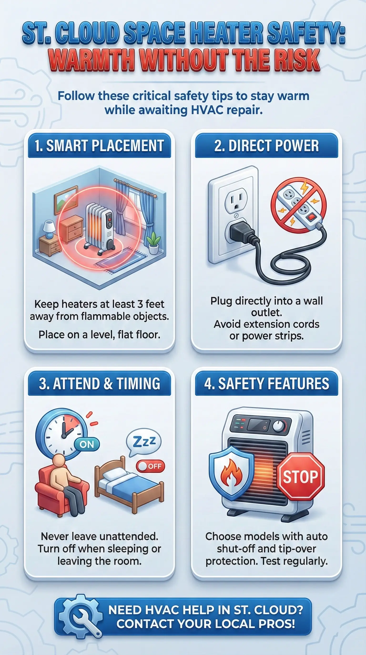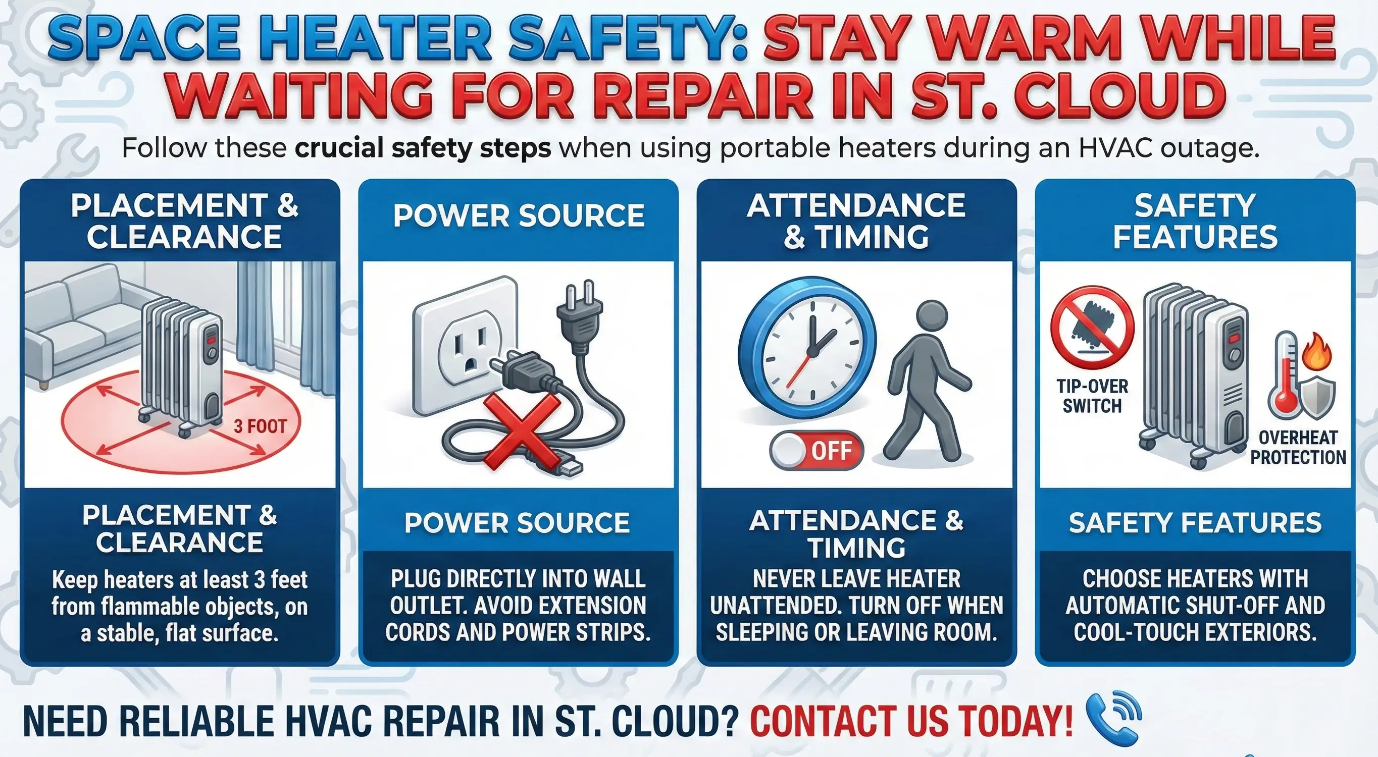 Local consideration: St. Cloud homes built before 1990 typically have 15-amp circuits that struggle with 1,500-watt space heater loads. Verify your electrical capacity before running multiple heaters during HVAC downtime.